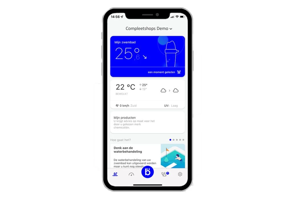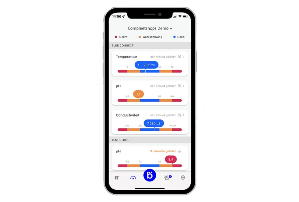 De Blue Connect app genaamd Blueriiot kun je installeren op je smartphone zodat je de Blue Connect kunt verbinden via je smartphone met de app. In de Blue Connect app kun je de waterkwaliteit van je spa of zwembad monitoren. Daarnaast stuurt de app meldingen zodra je chemicaliën toe moet voegen om de waterkwaliteit op peil te houden. De app geeft dan aan wat je moet toevoegen en de hoeveelheid, bijvoorbeeld 450 gram pH-. De kwaliteit van het water kan beïnvloedt worden door de weersomstandigheden, ook hier houdt de Blue Connect Plus Gold rekening mee. De Blue Connect meet dus niet alleen de waterkwaliteit, maar is je persoonlijke assistent voor de waterbehandeling van je spa of zwembad. Wil je alvast een idee krijgen hoe de app werkt? Dan kun je deze downloaden en installeren op je smartphone via de Apple app store of Google Play store en als demo gebruiken, je hebt hiervoor nog geen Blue Connect Plus Gold nodig.