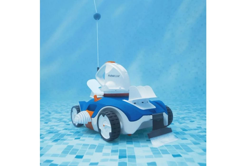 Deze Bestway Flowclear AquaTronix robot is perfect geschikt voor inbouw- en opbouwzwembaden met een vlakke bodem. De zwembadrobot werkt op Lithium batterijen waardoor er geen snoer nodig is en wordt ingeschakeld via een sensor zodra de robot volledig ondergedompelt is. Wanneer de batterijen volledig leeg zijn hebben deze een oplaadtijd van 5-6 uur. In het stalen filter welke te bereiken is aan de bovenkant van deze AquaTronix robot kan maar liefst 4,5 liter vuil opgenomen worden. Daarnaast beschikt de Bestway Flowclear AquaTronix over een zuigkracht van 2,7 m³/u en een snelheid van 1 km/u. Een reinigingsprogramma duurt gemiddeld 90 minuten.