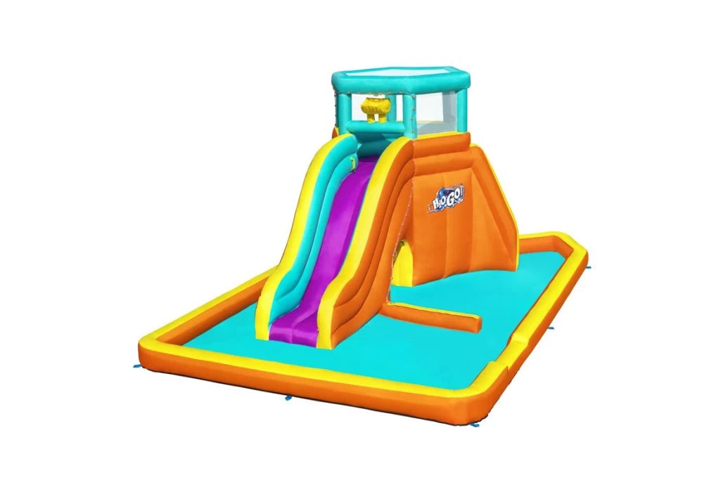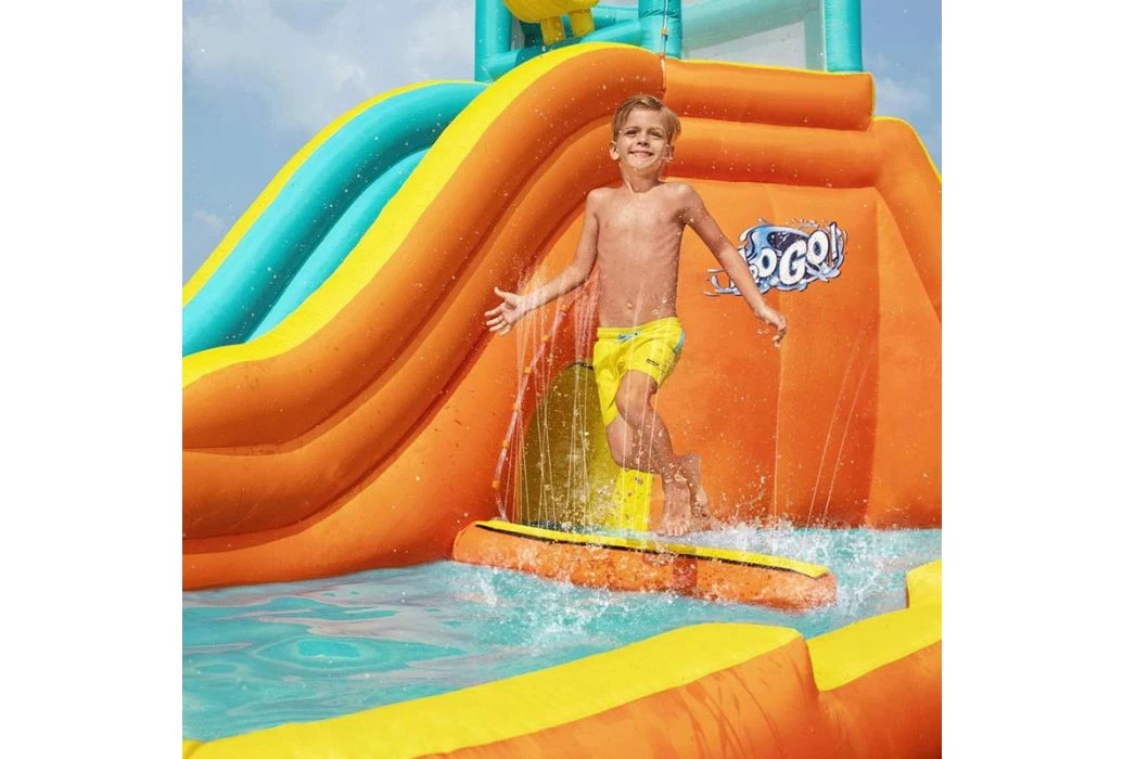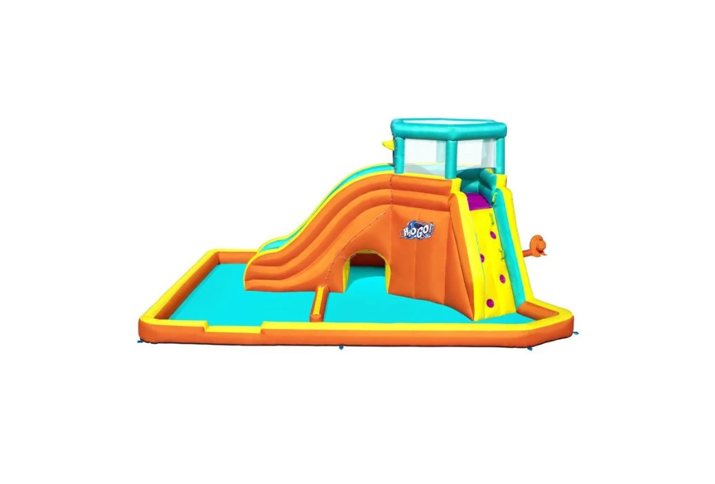 Het Bestway H2OGO! Tidal Tower waterpark is een groot, opblaasbaar waterpark met enorm veel mogelijkheden voor uren speelplezier. Dit opblaasbare waterpark biedt ruimte voor maximaal 6 kinderen en heeft een glijbaan met een kiepemmer, sprinkler muur, kruiptunnel en een waterbassin. De glijbaan kun je bereiken via de klimwand aan de achterkant. Er wordt een blower meegeleverd waardoor het water binnen 2 minuten opgeblazen wordt.Â
