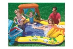 Het dinosaurus speelcentrum bestaat uit een dinosaurus, een palmboom waterval en een glijbaan. Het zwembad is eenvoudig op te zetten en is aan te sluiten op een tuinslang.